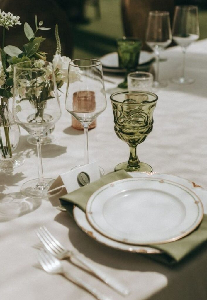 Glassware and cutlery are more than supporting elements—they’re essential accents. While clear crystal is often preferred for classic and formal settings, more relaxed or artistic tablescapes may feature colored or hand-blown glass goblets, adding vibrancy and artisanal charm—especially in countryside or coastal weddings where the atmosphere invites warmth and creativity. Gold or antique-silver cutlery, etched water tumblers, and refined finishes bring depth and personality to the setting. Layering different materials—ceramic, glass, linen, metal—creates a visual rhythm that feels collected, not forced.