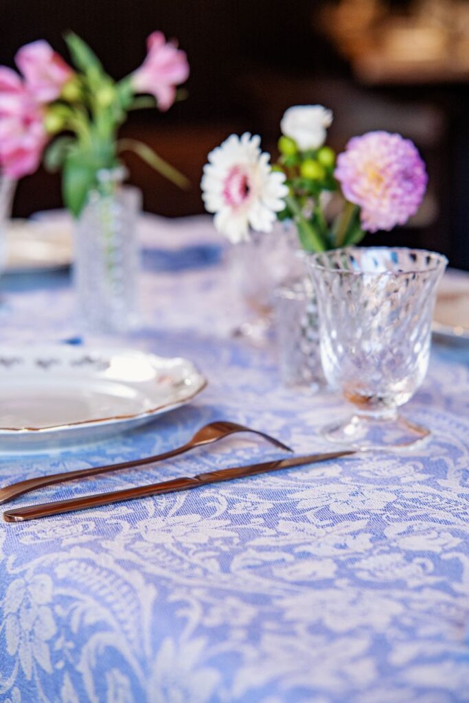 Another treasured detail lies in the textiles. In the medieval town of Anghiari, the Busatti family has been weaving fabrics since 1842, combining age-old techniques with a contemporary sense of style. Whether used for tablecloths, napkins, runners, or placemats, Busatti’s linens bring softness, texture, and quiet refinement to the table. Their natural hues—ecru, sage, dusty blue and pink—work in harmony with most palettes, and their weight and weave feel immediately luxurious to the touch. Many of their fabrics feature iconic woven patterns, ranging from elegant historical motifs to clean, modern designs—each one adding a subtle layer of identity and artistry to the mise en place. For couples seeking something truly personal, Busatti also offers made-to-order pieces, with the possibility to personalize each item with initials or custom details. Incorporating their textiles means adding not only beauty, but a piece of Tuscany’s living heritage.