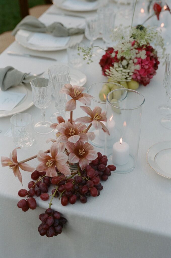 This style of decoration is especially evocative in countryside or garden weddings, where nature is already part of the scene. But even in more elegant settings, a cluster of pears or grapes on a linen tablecloth can add a tactile, sensual richness to the composition—without compromising sophistication.