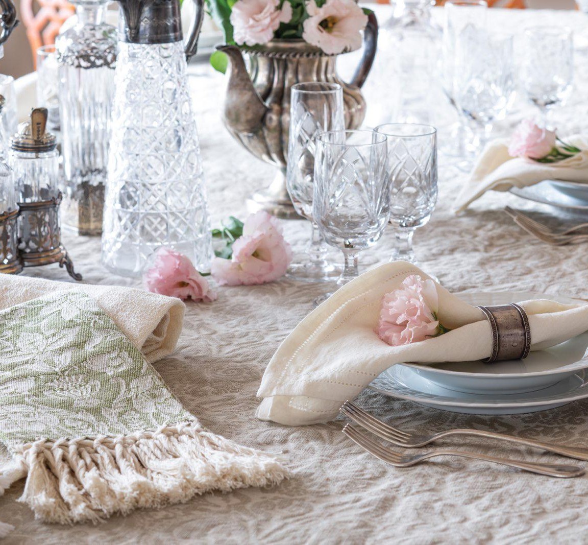 Another treasured detail lies in the textiles. In the medieval town of Anghiari, the Busatti family has been weaving fabrics since 1842, combining age-old techniques with a contemporary sense of style. Whether used for tablecloths, napkins, runners, or placemats, Busatti’s linens bring softness, texture, and quiet refinement to the table. Their natural hues—ecru, sage, dusty blue and pink—work in harmony with most palettes, and their weight and weave feel immediately luxurious to the touch. Many of their fabrics feature iconic woven patterns, ranging from elegant historical motifs to clean, modern designs—each one adding a subtle layer of identity and artistry to the mise en place. For couples seeking something truly personal, Busatti also offers made-to-order pieces, with the possibility to personalize each item with initials or custom details. Incorporating their textiles means adding not only beauty, but a piece of Tuscany’s living heritage.