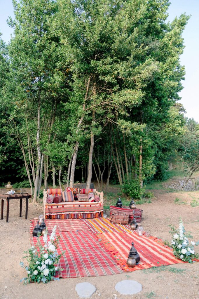To honour the bride’s Turkish background, we set out to create a space that felt like home, thousands of miles away from where her story began. We designed a dedicated Middle Eastern-inspired lounge area, furnished with authentic Persian rugs, low wooden tables, embroidered cushions, and antique brass accessories. It became a soulful corner—beautiful, warm, and deeply symbolic.