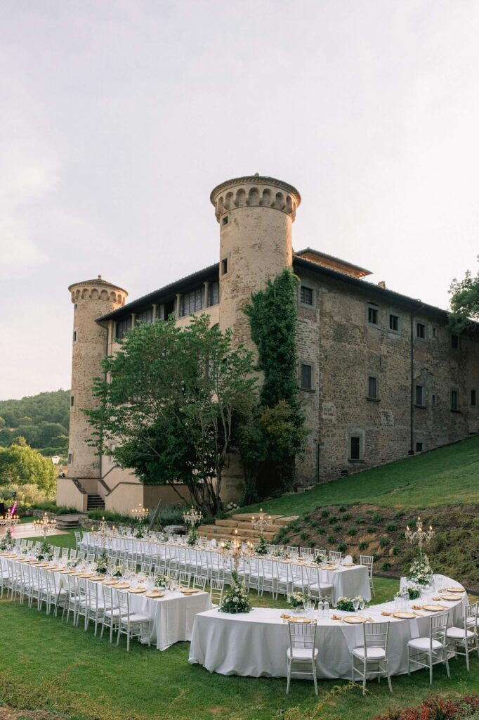 Slender candelabra cast a soft, golden light, enveloping the space in a welcoming and intimate glow. The floral arrangements, echoing those of the ceremony, featured white and green tones, chosen to honor the natural beauty of the Tuscan landscape. This balance between exotic refinement and local authenticity created an atmosphere that felt both curated and effortless—a table that didn’t just host a meal, but invited guests into a story of harmony, tradition, and heartfelt beauty.