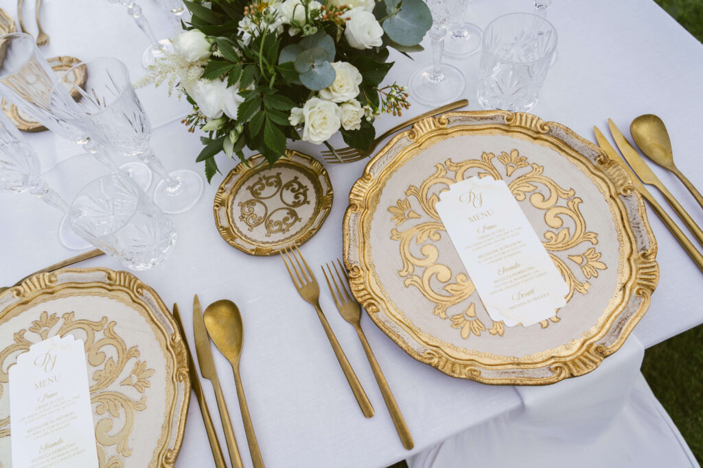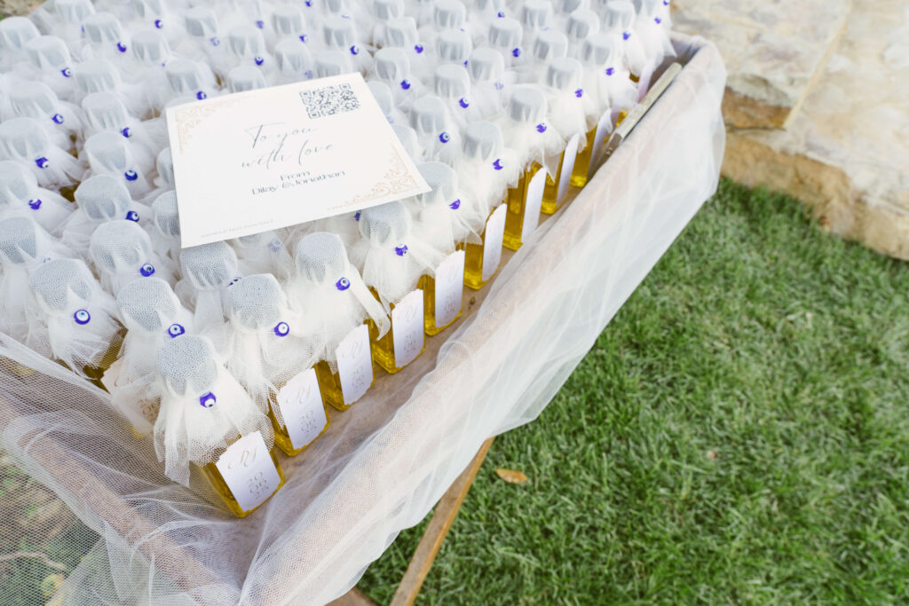 As guests entered the reception garden, the visual narrative continued—this time, through a tablescape that seamlessly blended elegance with cultural nuance. The mise en place featured subtle oriental-inspired details: refined golden-hued charger plates and diamond-cut goblets that echoed the warmth of Middle Eastern traditions. The stationery, designed in shades of burnished gold and sun-warmed earth tones, added depth and character, tying every element together.
